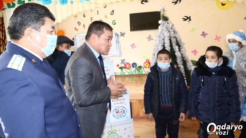Янги йил байрами арафасида туман ҳокими Н.Сулаймонов, туман прокурори Д.Кўбаев, тегишли масъуллар ҳамда "Қорбобо" ва "Қорқиз" ҳамроҳлигида 63-сонли ёрдамчи махсус мактаб интернати тарбияланувчиларининг байрам тадбирида иштирок этишди.